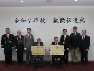 | 令和7年秋の叙勲伝達式 元士別市消防団 分団長 山下 隆氏、同じく分団長の大久保 健一氏が令和7年秋の叙勲で「瑞宝単光章」を受章されました。 山下氏は、昭和48年から平成23年まで38年余りにわたり消防団員としての任を全うされました。 大久保氏は、昭和51年から平成24年まで36年余りにわたり消防団員としての任を全うされました。 お二方とも消防団活動を通じて地域住民の生命、身体及び財産を守るとともに、団員育成にも努められ、地域の消防防災活動に果たした功績は多大なものがございました。 ![]() ![]() |
